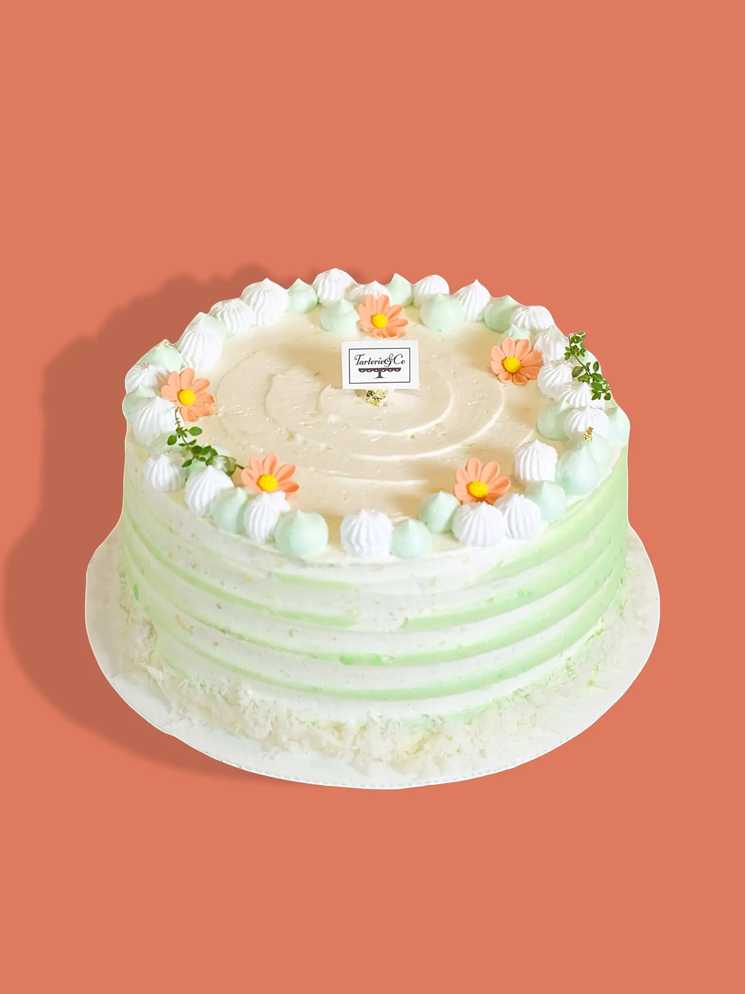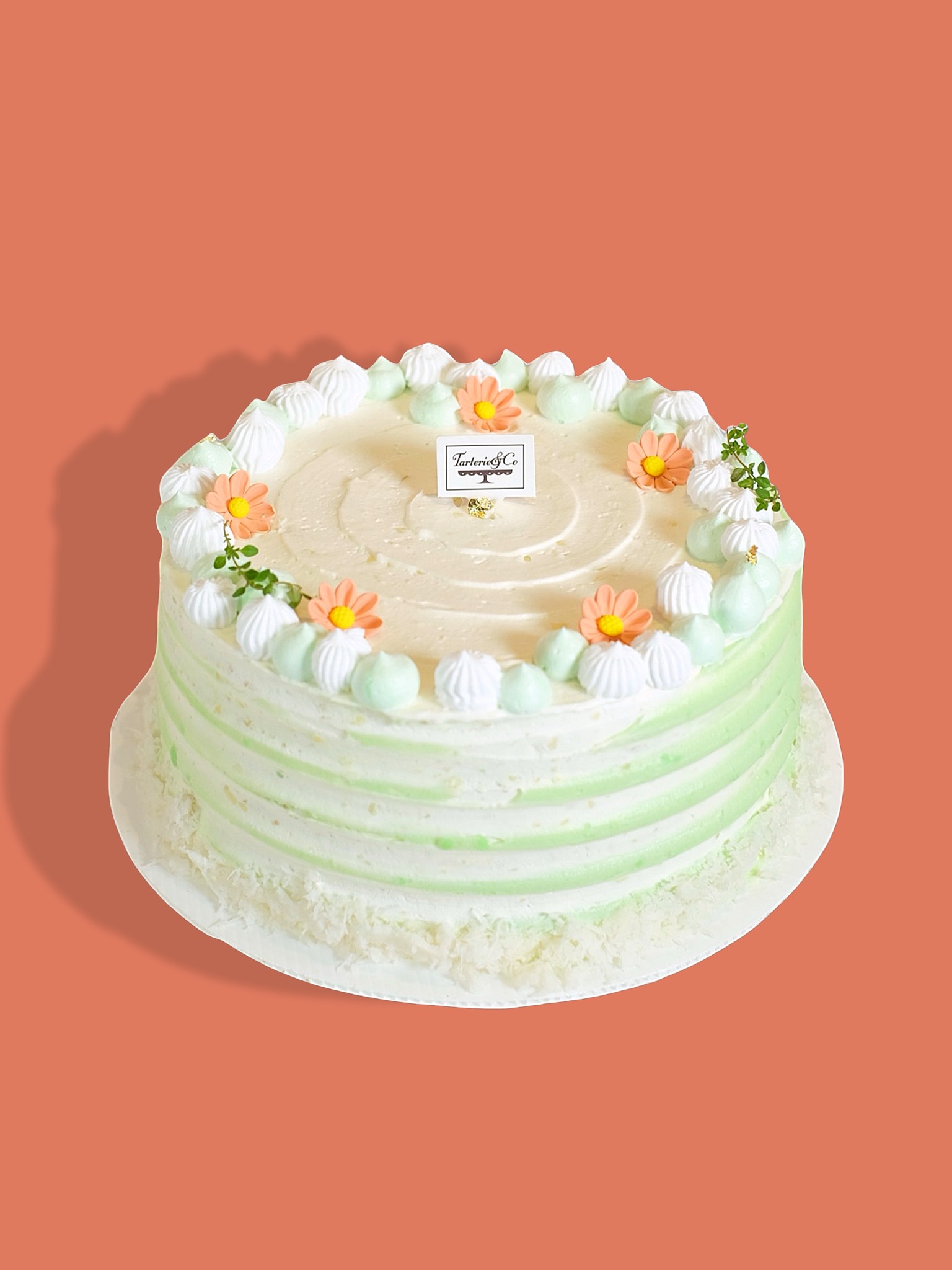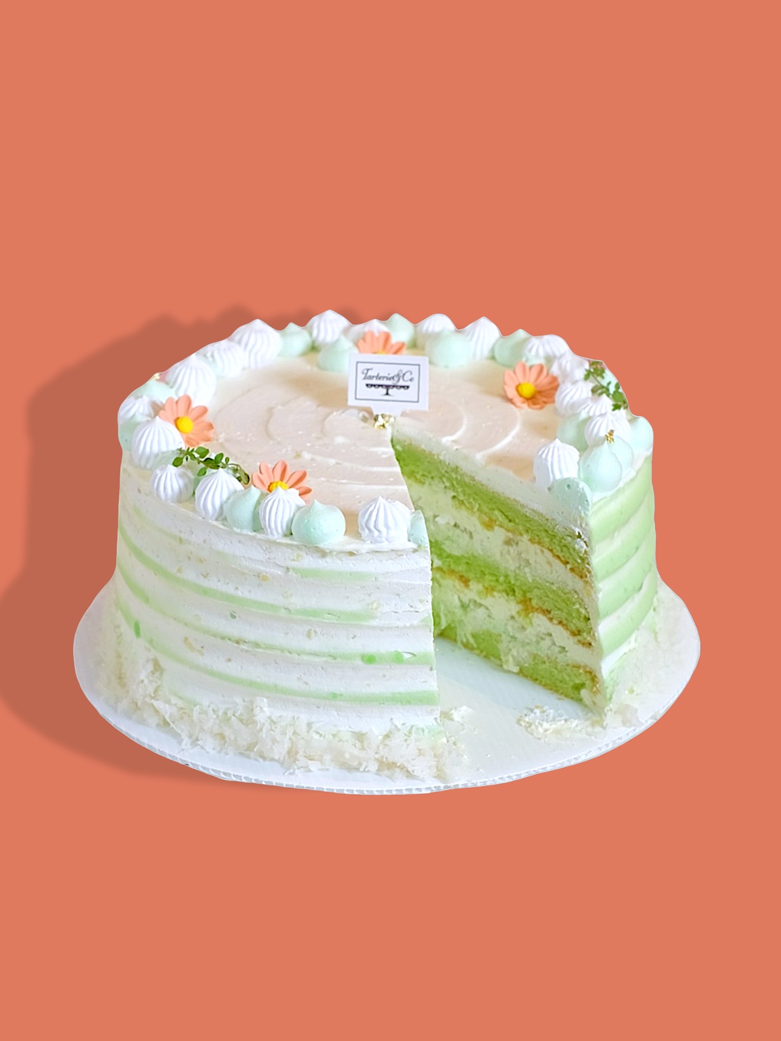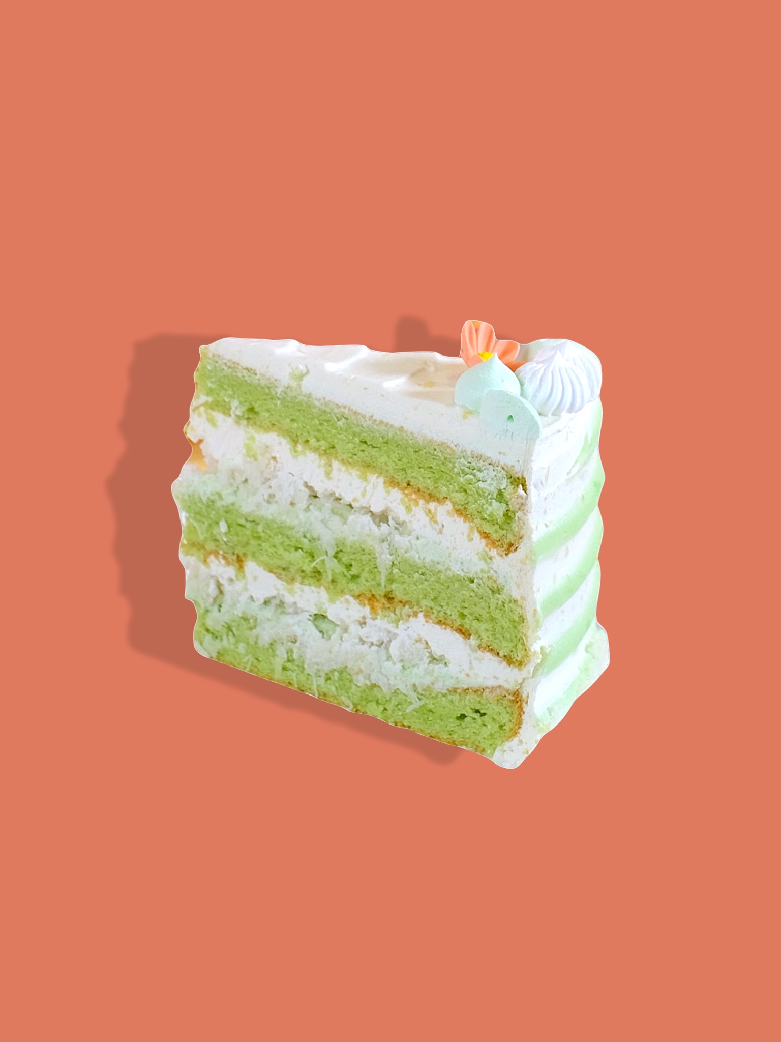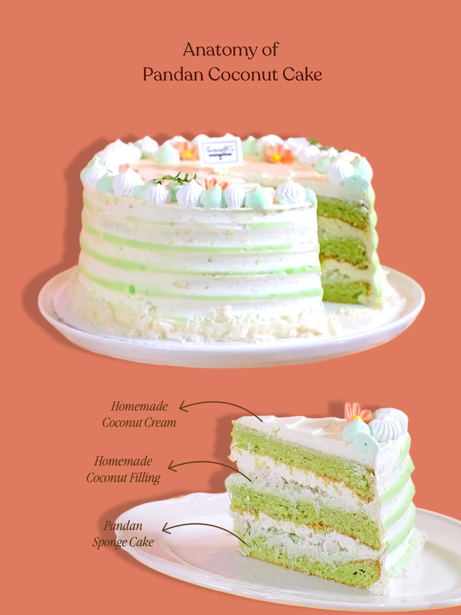 Pandan sponge cake filled with grated coconut filling and topped with our rich, homemade coconut cream. A fragrant and creamy tropical treat.
